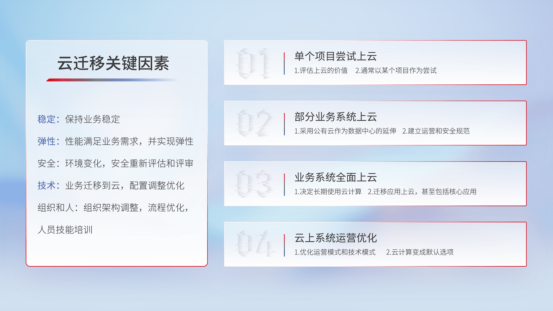 结合实际业务,,,从规划设计、、、、云平台选型、、、云原生改造、、、、数据迁移、、、集成交付,,,,迁移全过程为客户识别最佳上云路径,,,,做好风险识别管理,,,设计网络架构、、、身份权限、、安全审计合规、、、操作审计、、、、日志审计、、监控告警策略、、、、多站点容灾设计等,,,对云上基础设施进行整体规划,,,,提升IT治理水平,,,以满足弹性、、、、高可用、、高性能的需求。。。。