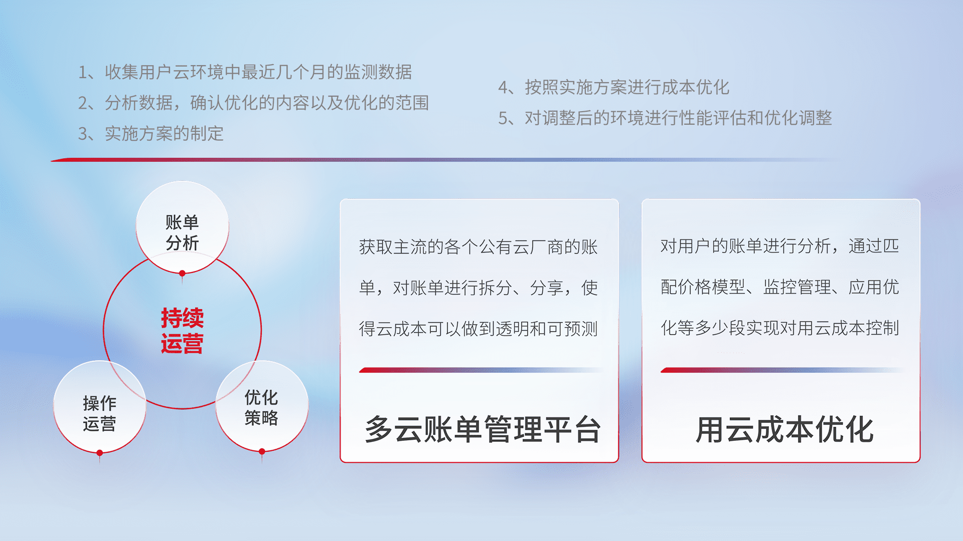 通过多云纳管,,,以统一的资源数据模型把客户的云资源进行抽象和封装,,,,进而实现对多云资源的统一操作,,,,保障云资源管理的可靠性、、稳定性与可用性。。量身定制化运维内容,,配置、、开发运维、、补丁管理、、备份、、监控、、认证和访问管理、、、、审计和日常巡检等,,,,保障在用云过程中的可靠度,,,稳定度以及高可用率。。。